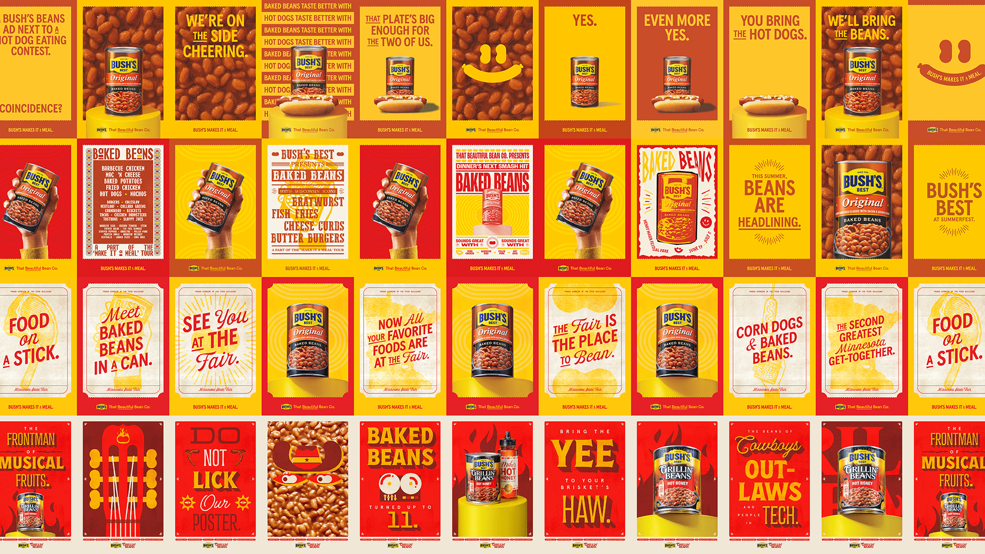 Summerfest is known for two things: music and food. We wanted Bush’s to live right at that intersection. So we asked the question, what if Bush’s Beans was a band? What would their tour posters look like, and who would they bring on the road? The result was a series of bold, genre-spanning visuals inspired by classic concert posters. Each one imagined a different lineup of foods sharing the stage with Bush’s. Loud, expressive, and packed with flavor, the work turned beans into headliners.