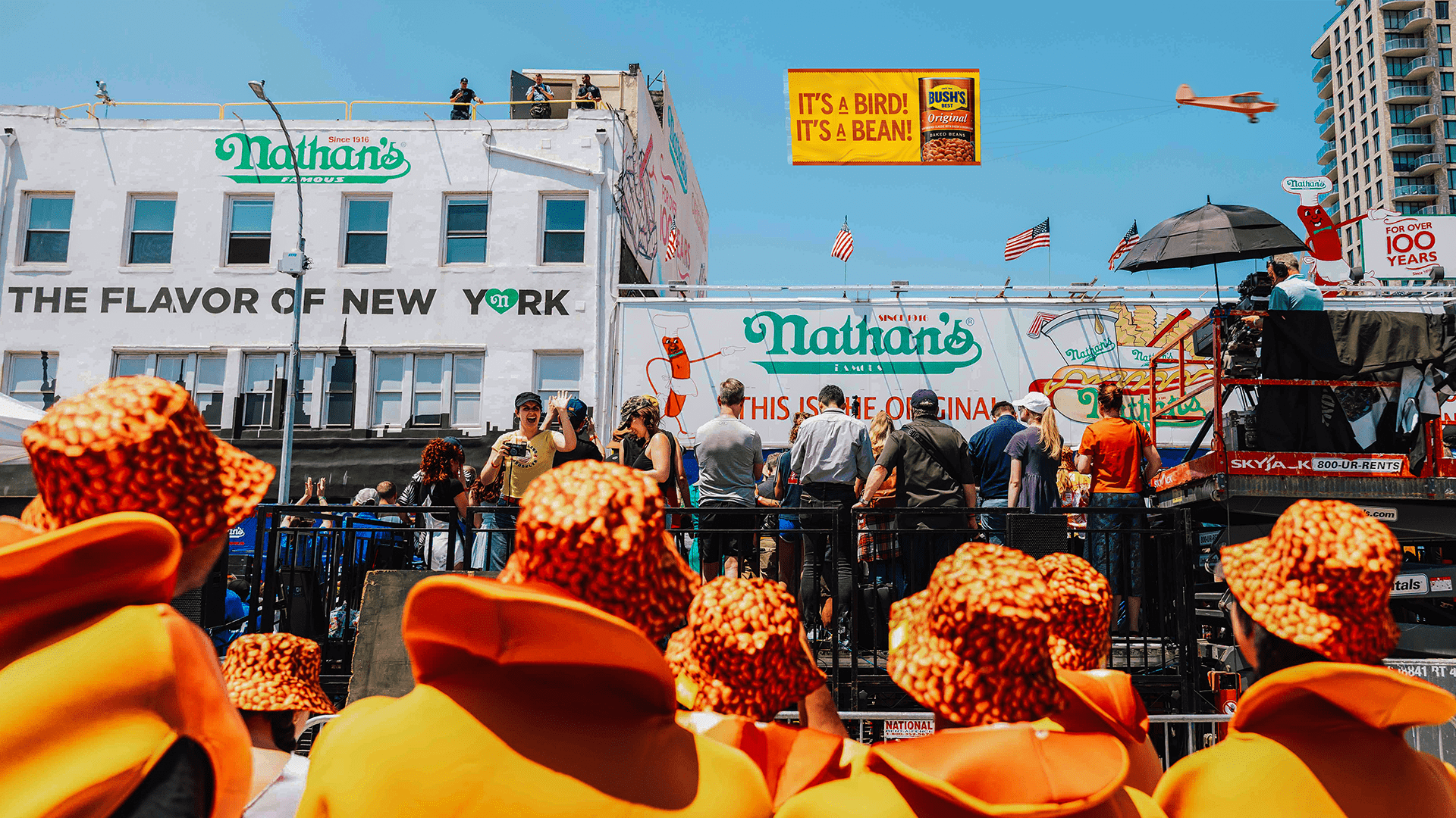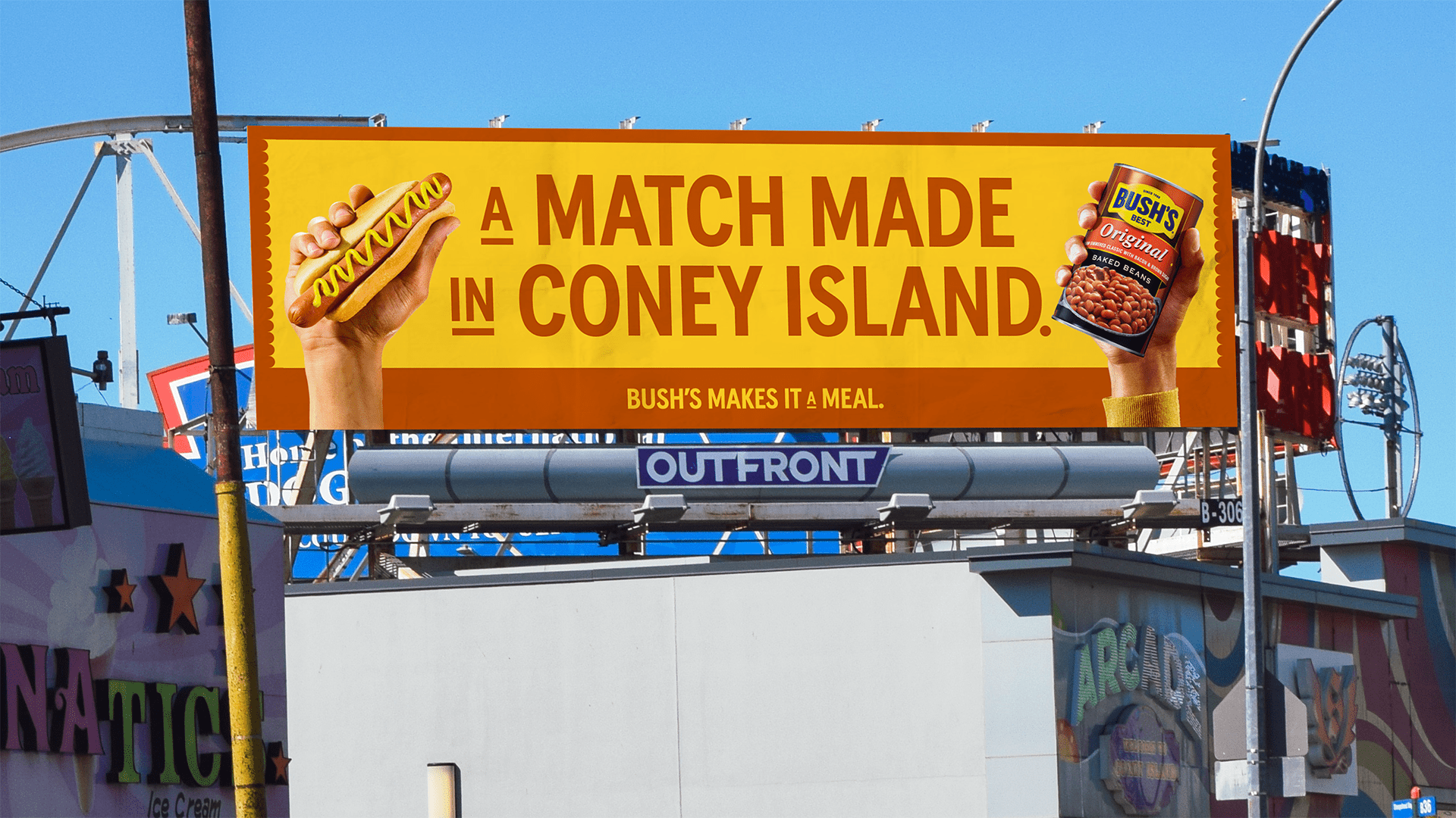We brought Bush’s to the heart of hot dog culture. At the Nathan’s Hot Dog Eating Contest, the goal wasn’t to steal the spotlight but to share it. This execution focused on the magic of the pairing, beans and dogs, two classics that shine brighter together. Every detail of the hot dog was styled to feel true to New York, from the chopped onions to the mustard to the bun that’s just a little too short. The work invited people to see what happens when two familiar staples come together and level each other up.